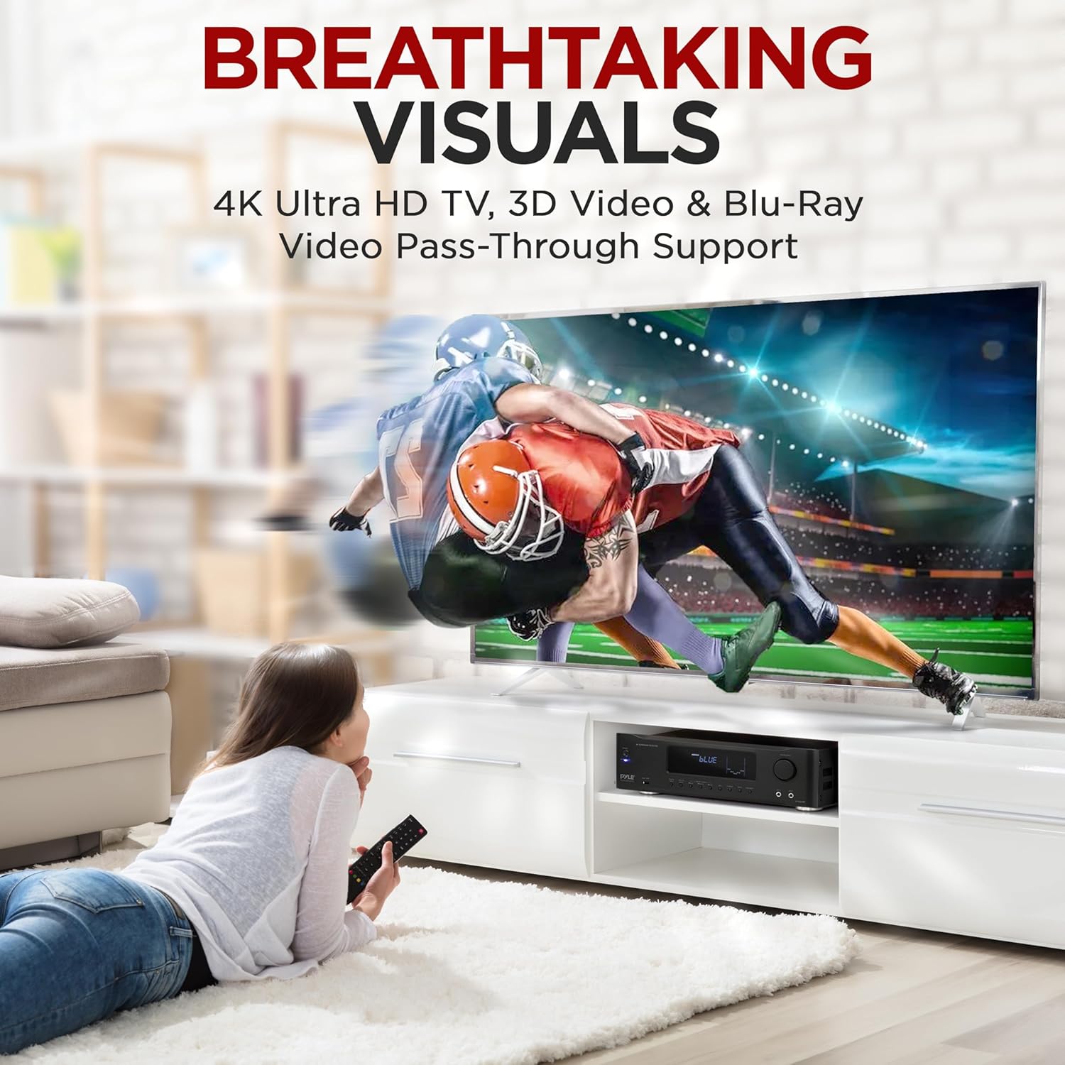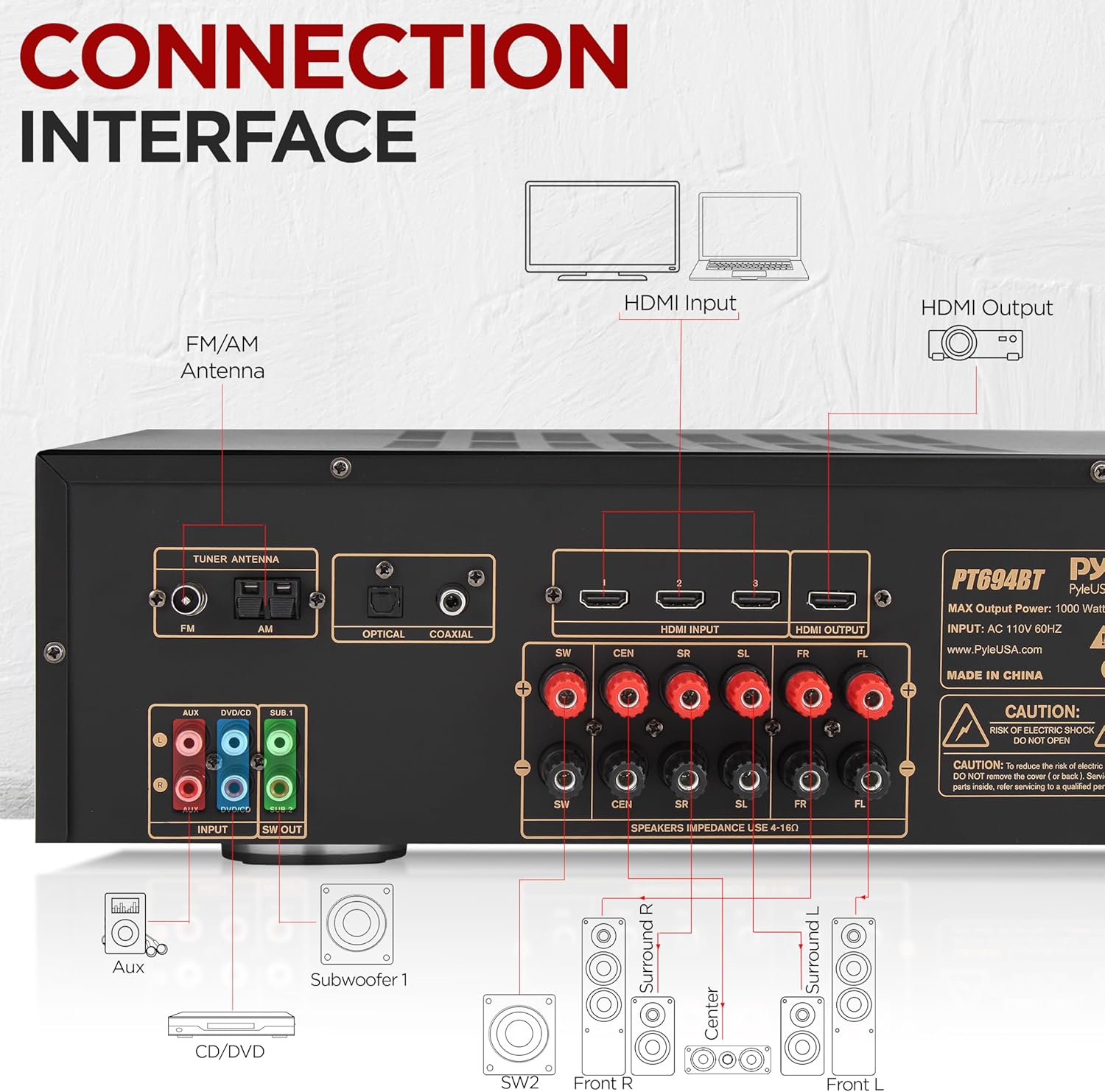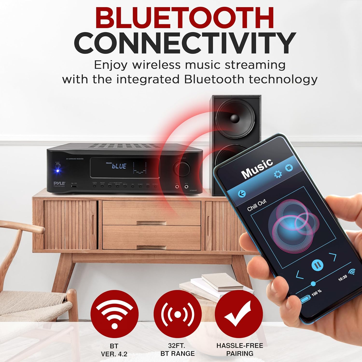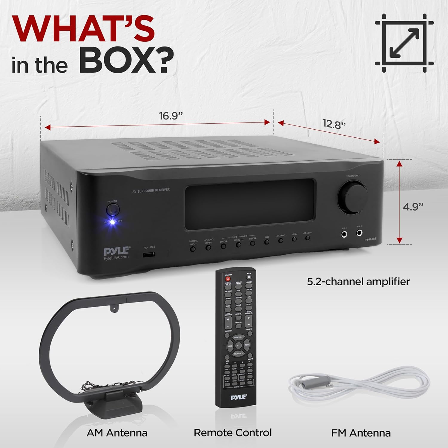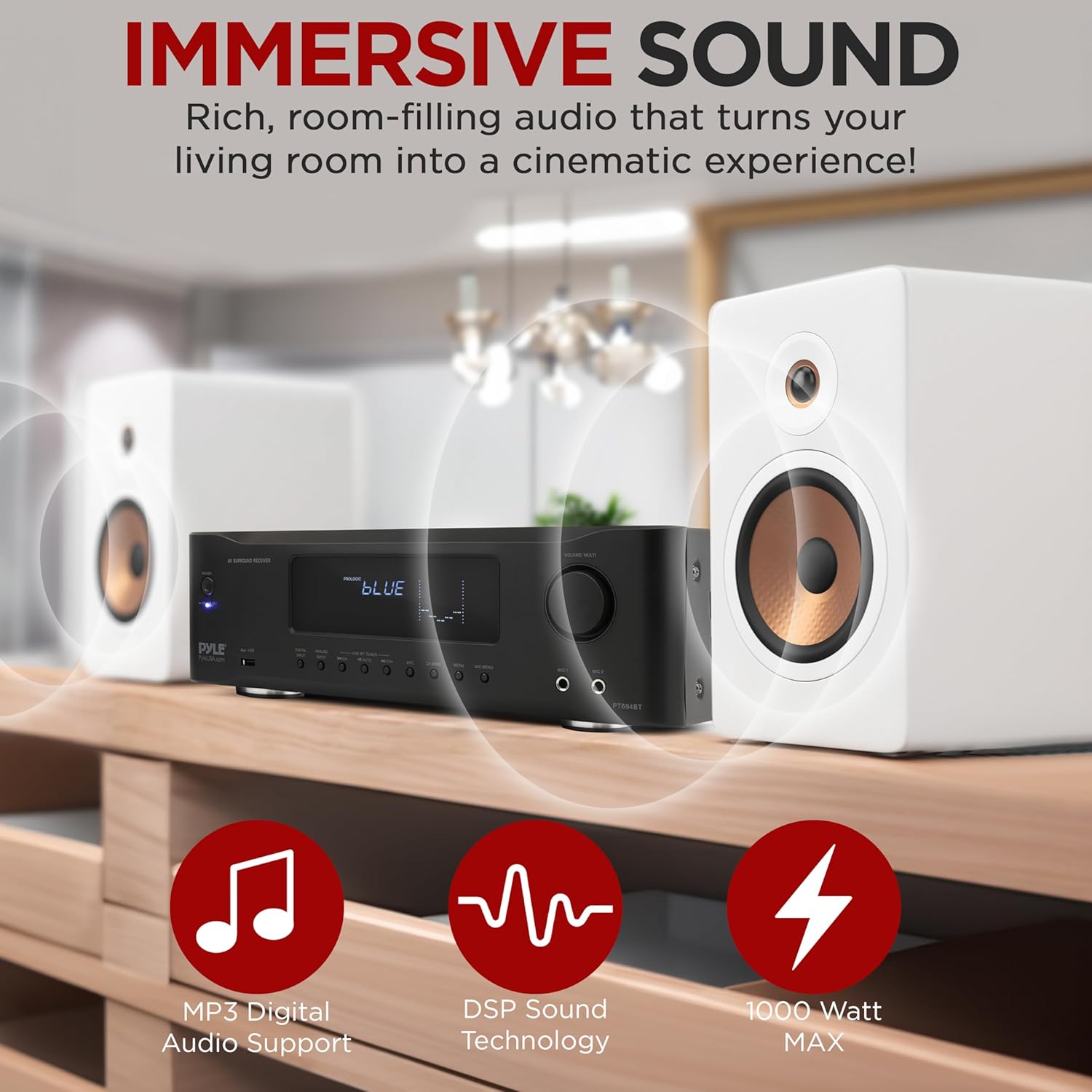Pyle 5.2-Channel Hi-Fi Bluetooth Stereo Amplifier – 1000 Watt AV Home Speaker Subwoofer Sound Receiver w/ Radio, USB, RCA, HDMI, MIC IN, Wireless Streaming, Supports 4K UHD TV, 3D, Blu-Ray